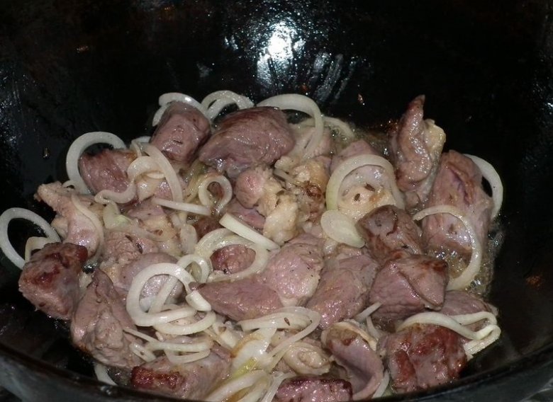 Нагреем казан, накалим в нем масло до появления белого дымка. Отделим лук в маринованном мясе, его лучше не использовать в блюдо, он уже отдал все что нужно. Мясо опустим в казан и пару раз перемешав, добавим нашинкованный кольцами лук. Продолжим жарку до полуготовности.