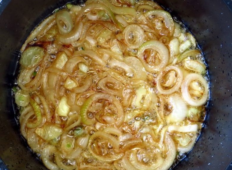 Первоначально решил попробовать все по рецептуре. Итак, берем казан, раскаляем в нем растительное масло и пассеруем кольца лука.