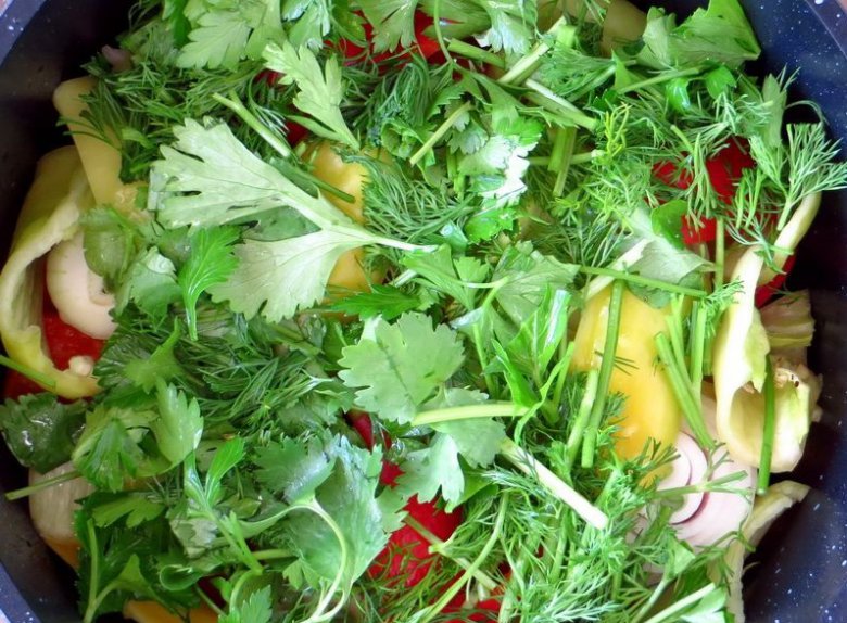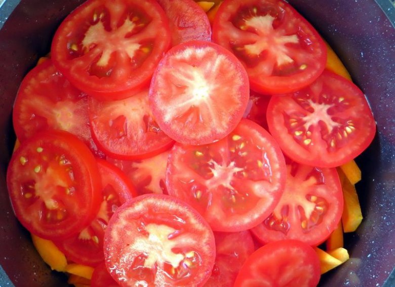 Болгарский перец и зелень обеспечат прослойку между помидорами и картошкой. Некоторые сорта картофеля при контакте с помидорами становятся "стеклянными" и не вкусными.