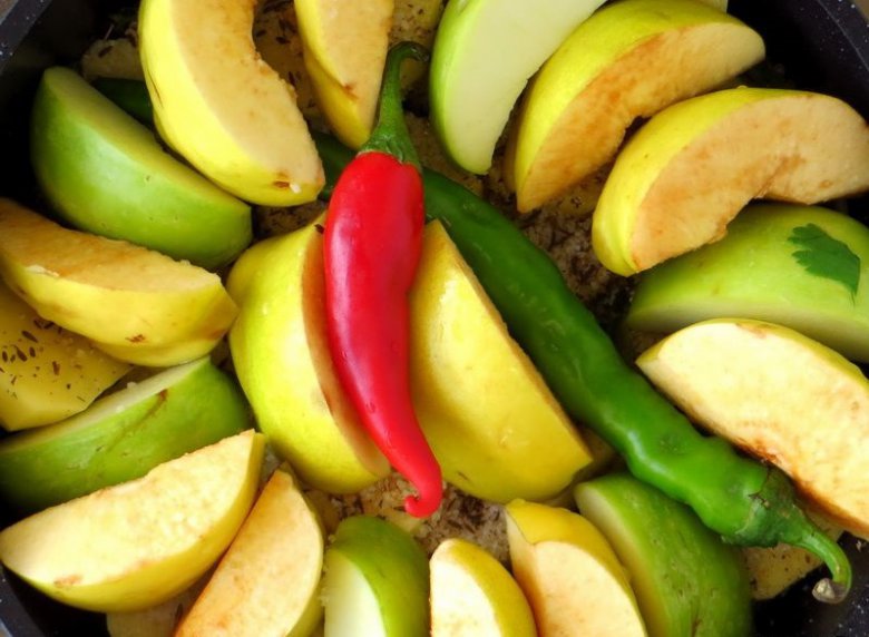 Нужно ли говорить о количестве и видах ингредиентов? Если нужно, возьмите пропорции у Махмудова: 300 г масла, 1 кг лука, 1 кг помидор, 0,5 кг моркови, 0,5 кг картофеля, по 2 пучка кинзы, укропа и веточки жамбила, 3-4 шт. болгарских перца, 0,5 кг яблок, 0,5 кг айвы. Соль и специи – по вкусу. А если чего и нет, берем все в произвольном порядке на свой вкус и фантазию.