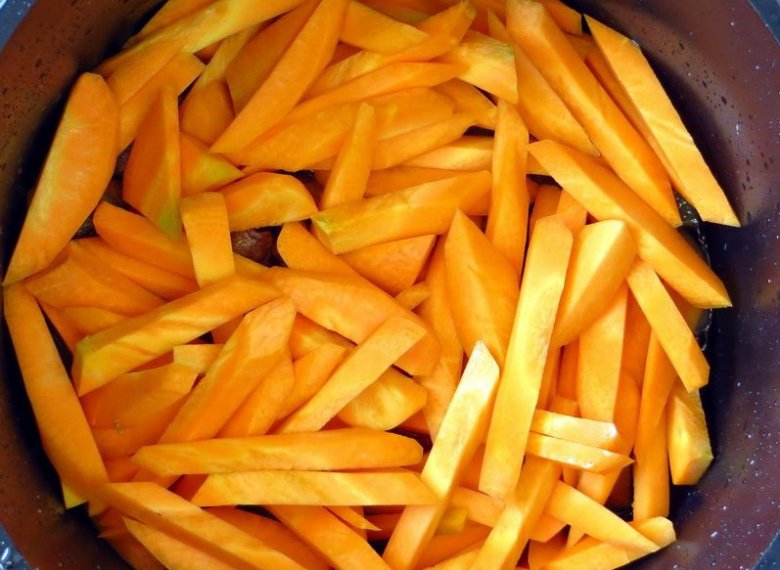 Убавляем огонь, начинаем класть слоями заранее подготовленные продукты. Морковь, нашинкованную соломкой.