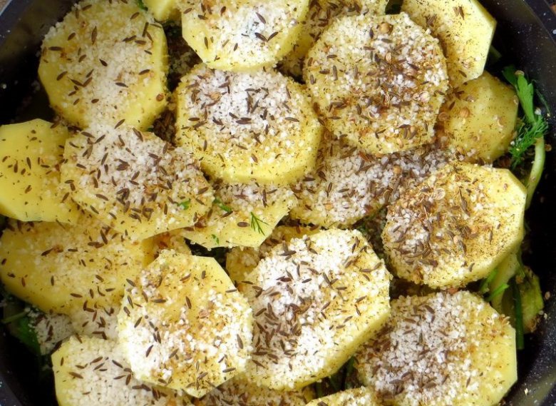 Теперь можно уложить кружочки картофеля. Солить можно каждый слой отдельно, или, перемешав со специями, посыпать сверху.