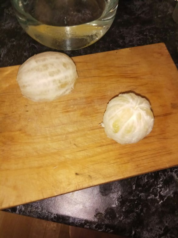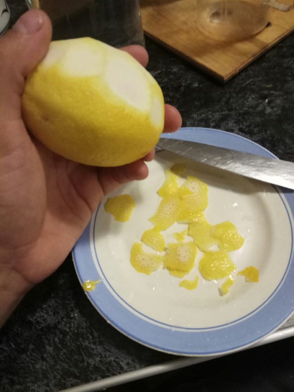 Нас интересует только желтая тонкая кожица. Белую мякоть (хз, как называется) стараемся не задеть, будет горчить. Потом чистим до тела, собственно, лимона.