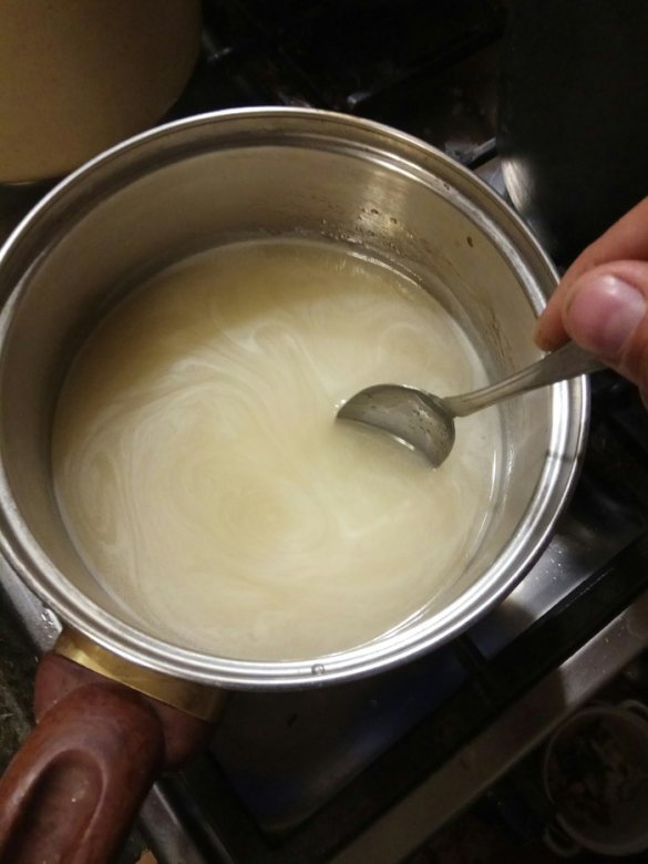 Затем необходимо приготовить сироп из инвертированного сахара. Для этого нагреваем 200 мл воды, добавляем, постоянно помешивая, 400 г сахара, затем 2-3 г лимонной кислоты.