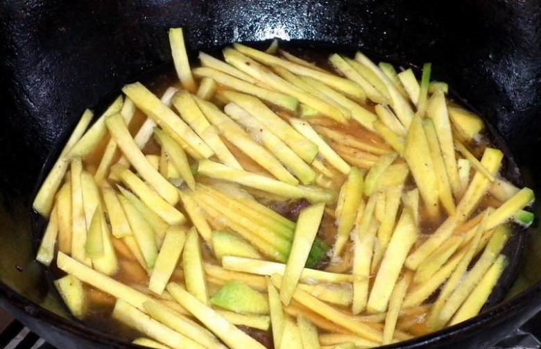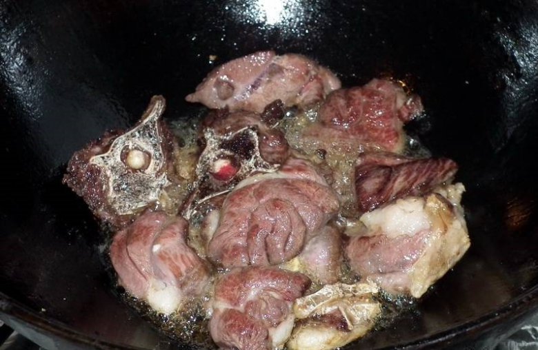 Нагреем казан, накалим масло. У меня немного курдюка было, вытопил его, по готовности добавил немного подсолнечного и чуть-чуть кунжутного масел. Как масло нагрелось достаточно, обжарил мясо до легкой корки.