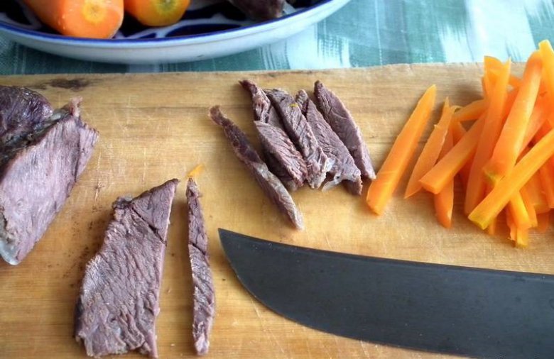 Пока плов доходит до нужной кондиции, подготовим "гарнир" из мяса и моркови, которые порежем одинаковой соломкой.