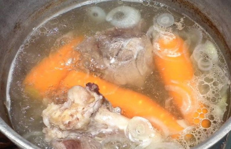 В казан опускаем одну часть мяса крупными кусками, если есть с костью то его можно использовать тоже, залить водой и варить бульон на медленном огне, снимая пену. Затем добавить часть лука, нашинкованного кольцами, и очищенную морковь целиком, посолить и варить до готовности всех продуктов.