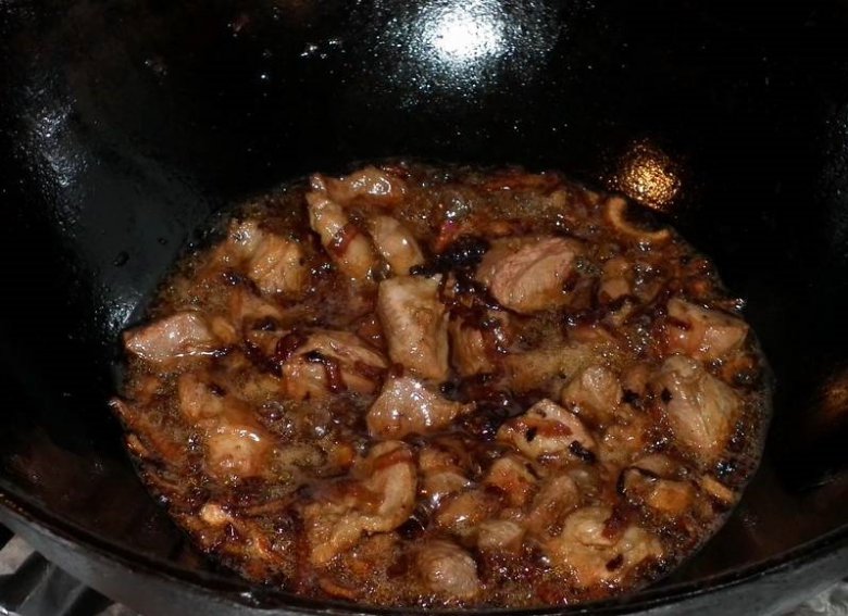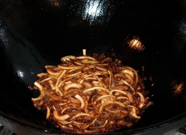 Как обычно, нагрел казан, растопил в нем немного курдюка, удалил шкварки, добавил недостающее количество растительного масла. Как нагрелось обжарил кольца лука до сильного румянца. Вообще применил технологию ферганского плова, но думаю для этого плова более приемлемо было бы использовать технику с немного замоченным рисом и менее сильно обжаркой.