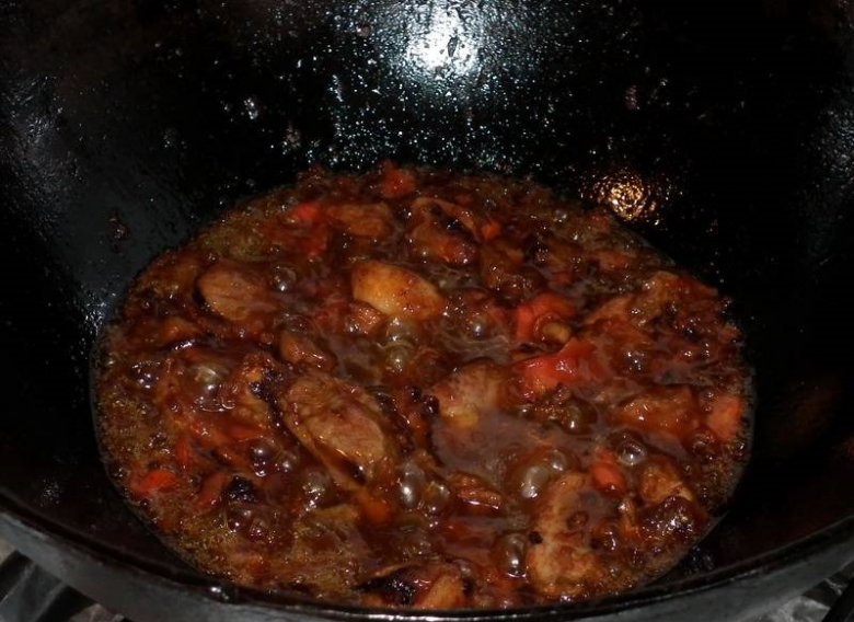 Залил воды, и как только закипела, посолил и добавил зиры. И при медленном булькании поварил минут 30. Как ни странно, бульон должен был напоминать жаркое, но почему то он очень был похож по вкусу на пловный зирвак!? - Это все наверно настрой )))).