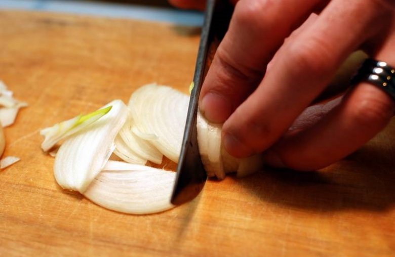 Теперь режем лук, не полукольцами, а соломкой вдоль.