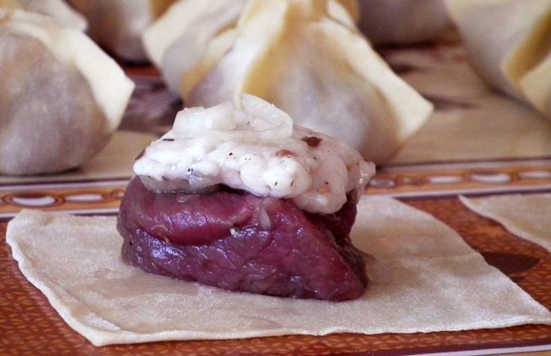 Уже давно заглядывался на один вариант, в котором мясо для мантов не нарезается мелко, и уж тем более не пропускается через мясорубку, а режется крупными кусками грамм по 10-15, как для шашлыка.