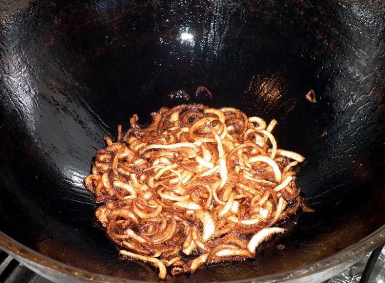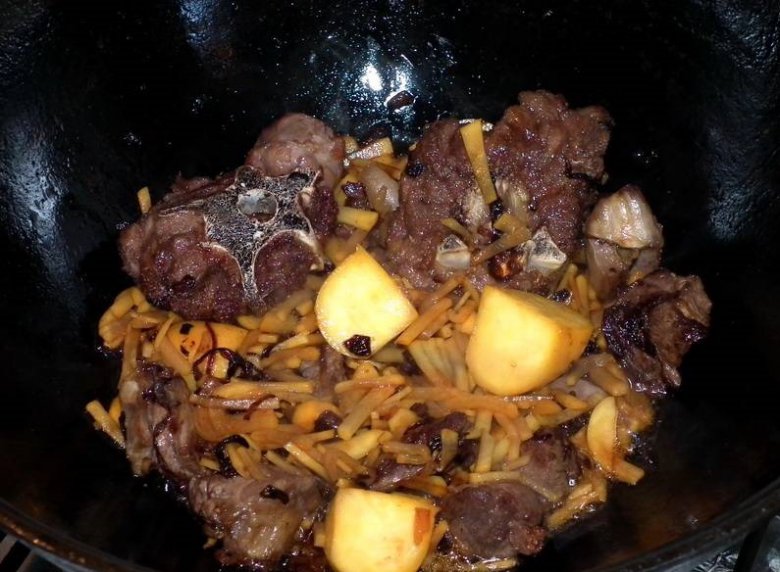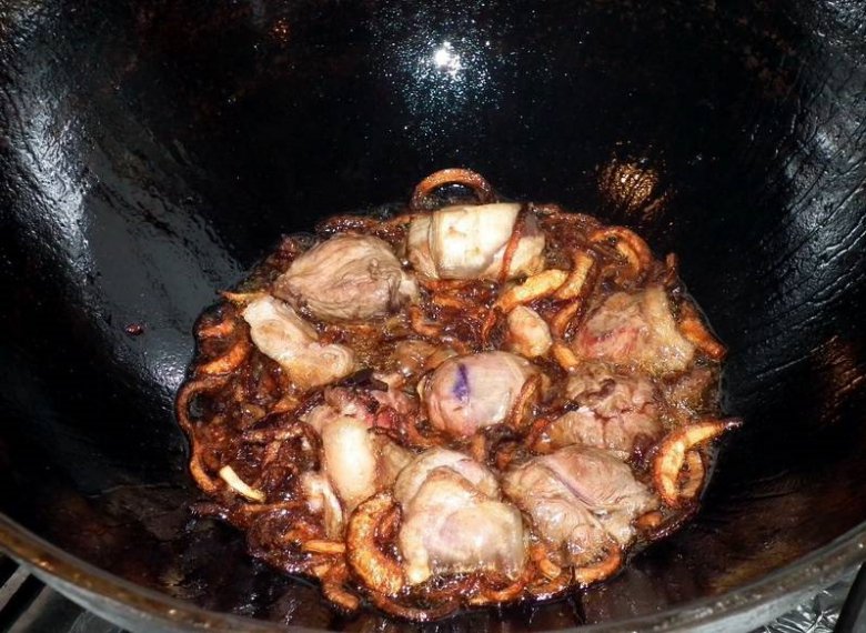 В казане накаляем вытопленный курдючный жир или растительное масло, а лучше их сочетание. Обжариваем до коричневого цвета лук, порезанный кольцами, затем до румяной корки мясо, порезанное как на шашлык.