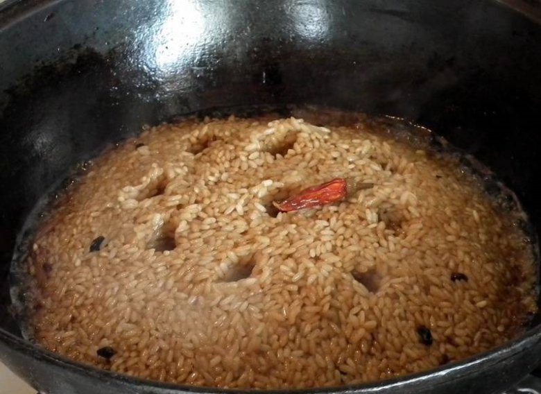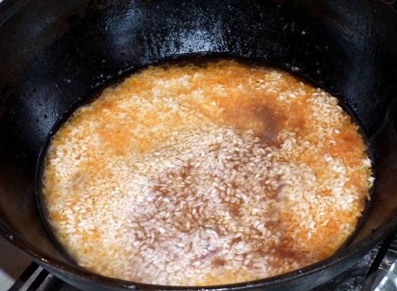 Когда зирвак будет готов солим его, добавляем зиру. Добавляем промытый рис, выравниваем, заливаем кипяток. Количество заливаемой жидкости зависит от сорта риса. Увеличиваем огонь и выпариваем всю воду, когда рис будет почти готов, и воды в казане не останется, собираем горкой, накрываем крышкой, уменьшаем огонь на самый минимум и ждем 20 минут.