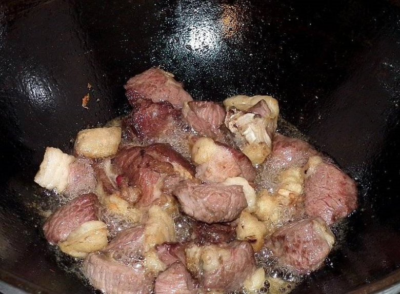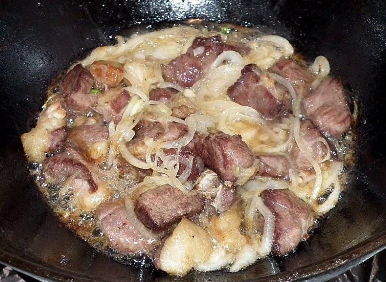 Подготовив все ингредиенты, начинаем готовить плов. Нагреваем казан и накаляем масло. Затем обжариваем мясо до румяной корки, можно порезанное на небольшие кусочки, а можно крупными кусками, и перед подачей на стол нарезаем его. Затем не сильно обжариваем часть лука, порезанного кольцами.