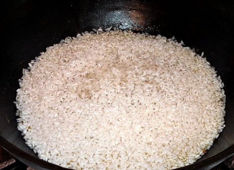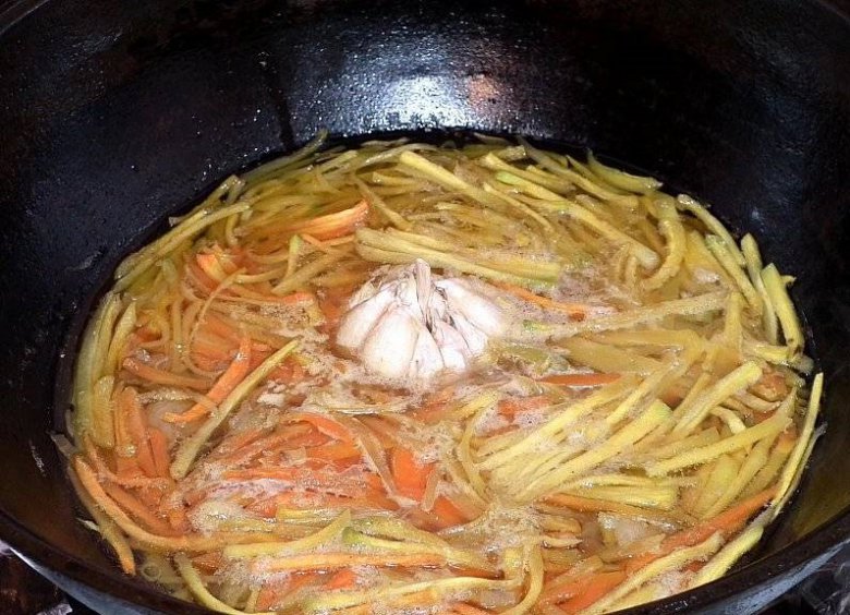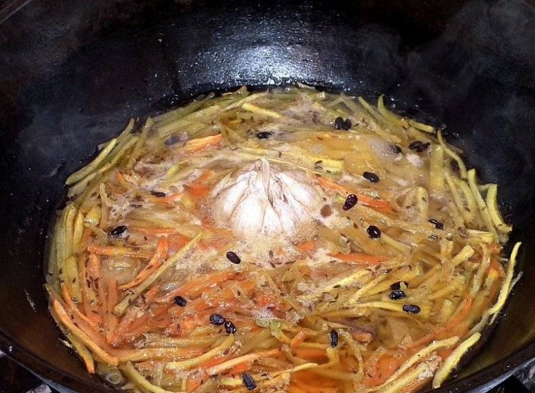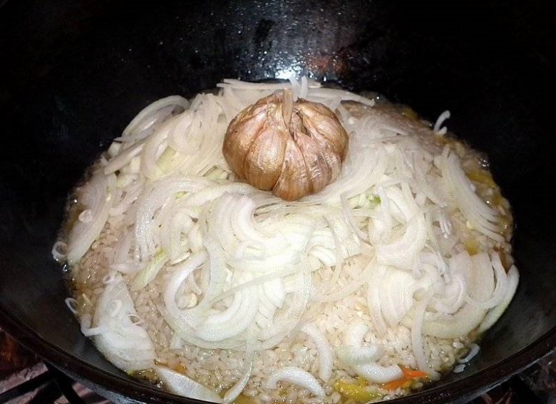 По готовности зирвака, сливаем с риса воду и аккуратно перекладываем хорошо набухший рис на морковный слой. Чеснок перед закладкой риса лучше вынуть.