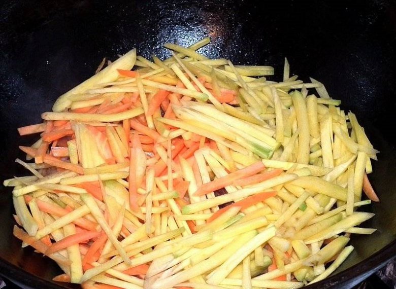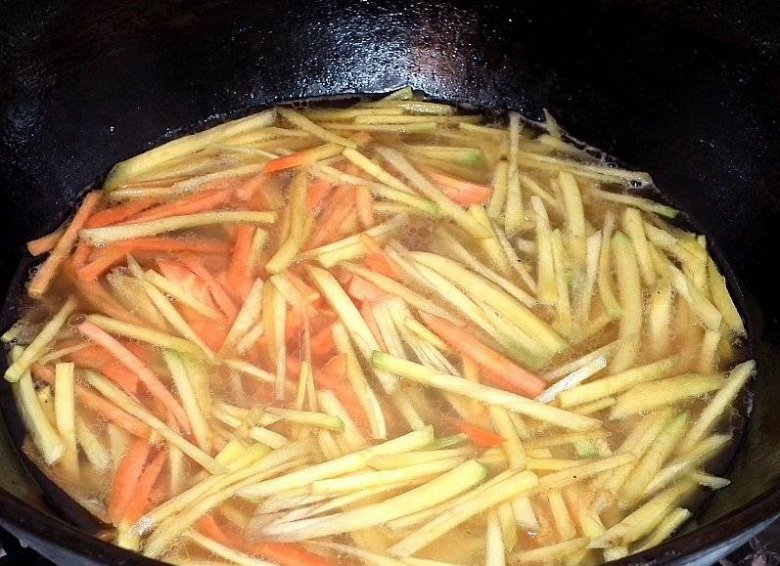 Положить в казан морковь, нарезанную средней соломкой, и не обжаривая ее, залить водой до уровня содержимого казана. Довести до закипания, и уменьшив огонь, томить на медленном кипении около 1 часа.