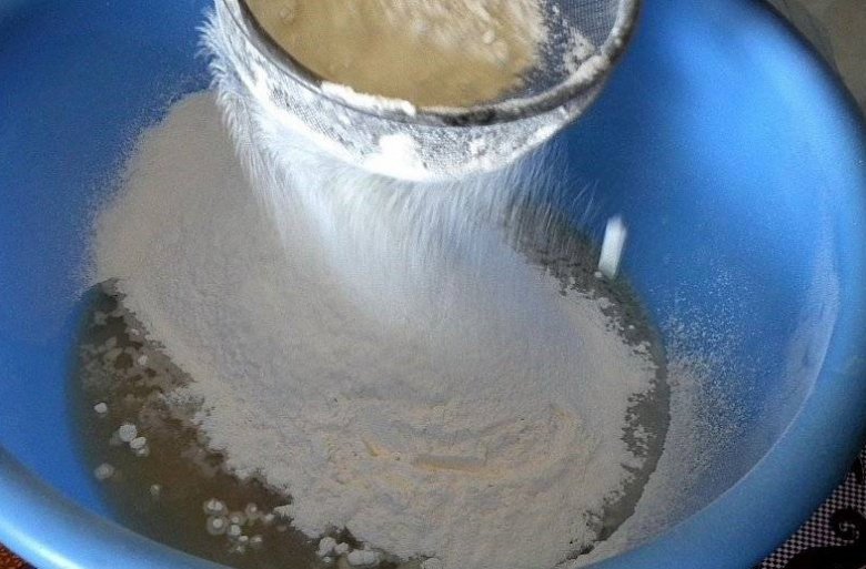 Затем яичную массу переливаем в посуду для замеса теста. Добавляем просеянную муку понемногу и месим тесто. Добавлять муку следует до тех пор, пока не получится достаточно крутое тесто, которое должно быть не слишком крепкое и легко отходить от рук.