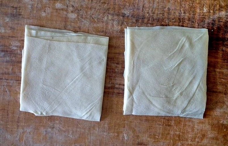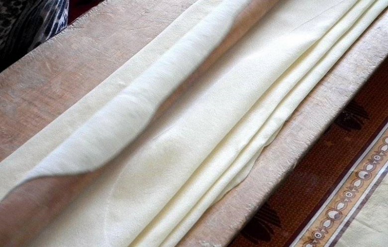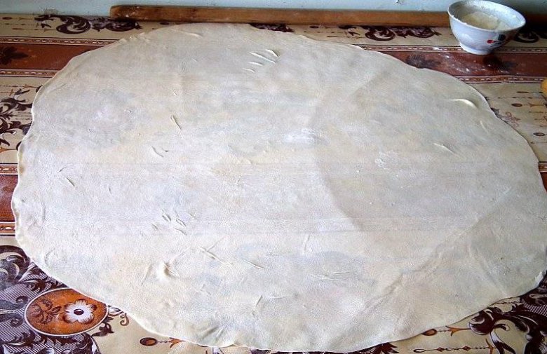 В результате должен получиться большой и тонкий лист. Тесто должно быть почти прозрачное.