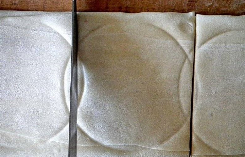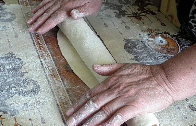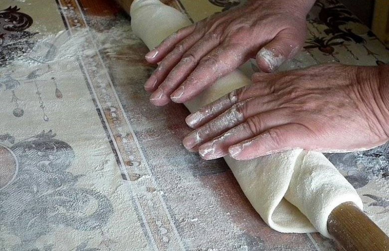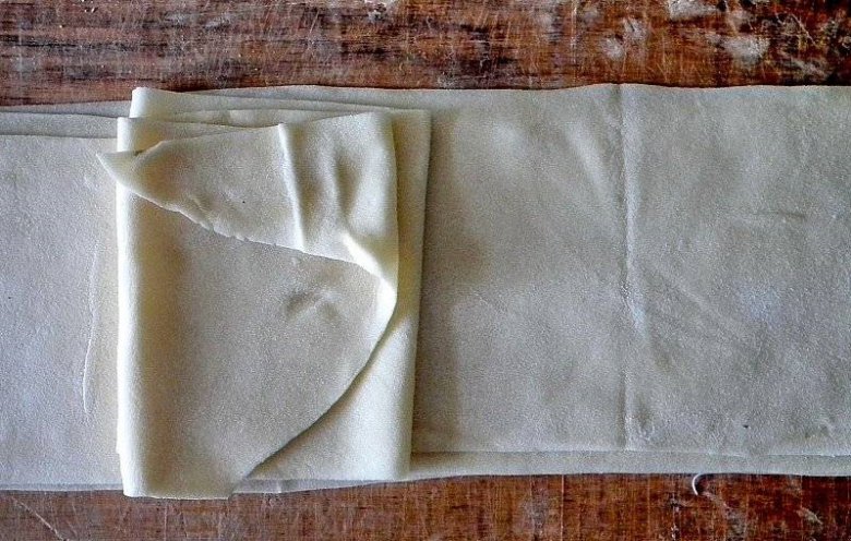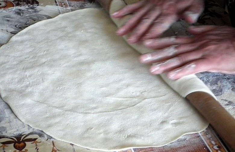 Тесто плотно скручивается на скалку, и затем катая вперед-назад, получают большой пласт.