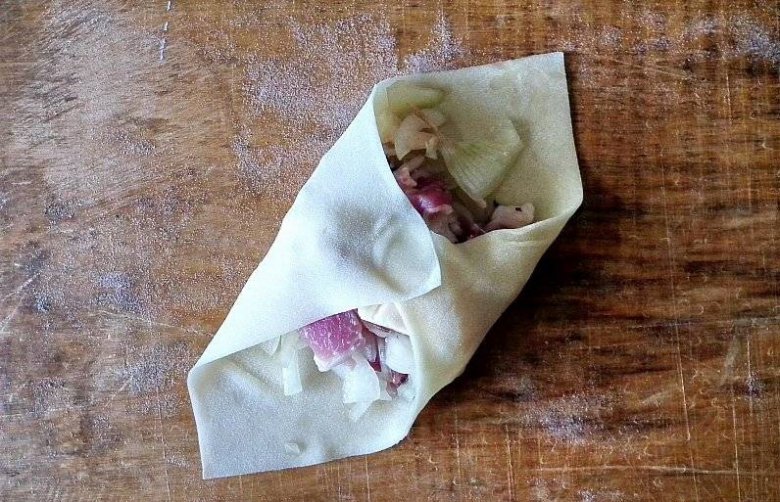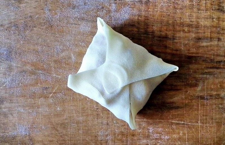 Стягиваем противоположные уголки теста и закрепляем их друг с другом, сильно ущипнув двумя пальцами.