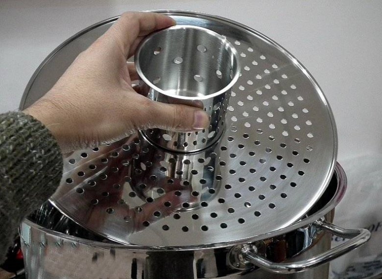Если кто не знает, мантышница - это паровая кастрюля с обычно двумя отсеками. В нижний отсек наливается вода, в верхнем находятся ярусы - листы с дырками.