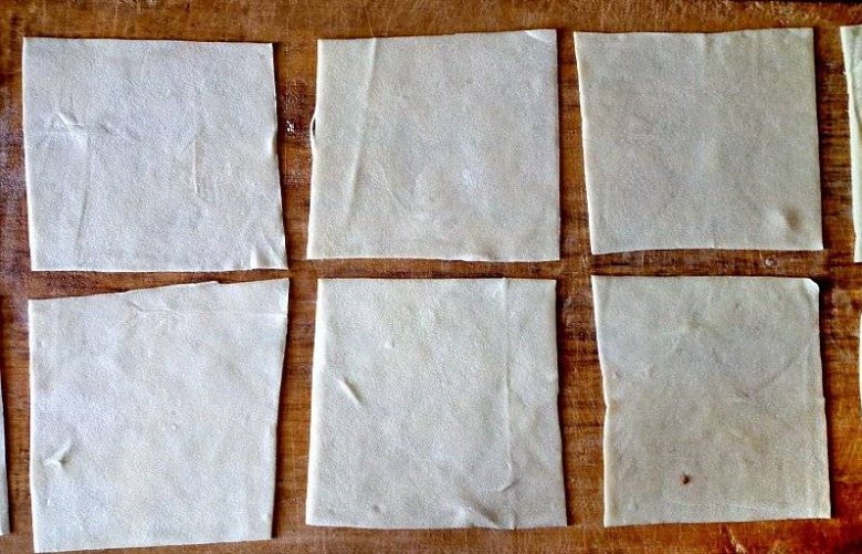 Теперь лист нужно разрезать на одинаковые квадратики со сторонами примерно 10 см. Для этого наматываем тесто на скалку и раскатываем гармошкой на длинную доску.