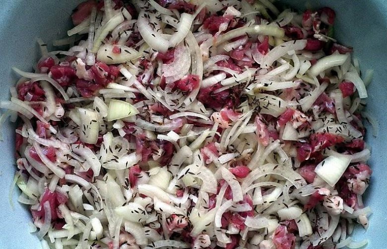 Теперь перемешиваем лук и мясо, добавив по вкусу соли, черного молотого перца и желательно зиры. Также можно добавить мелко нарезанное курдючное или нутряное сало, но лучше всего его положить по 1-2 штучки при формировании мантов.