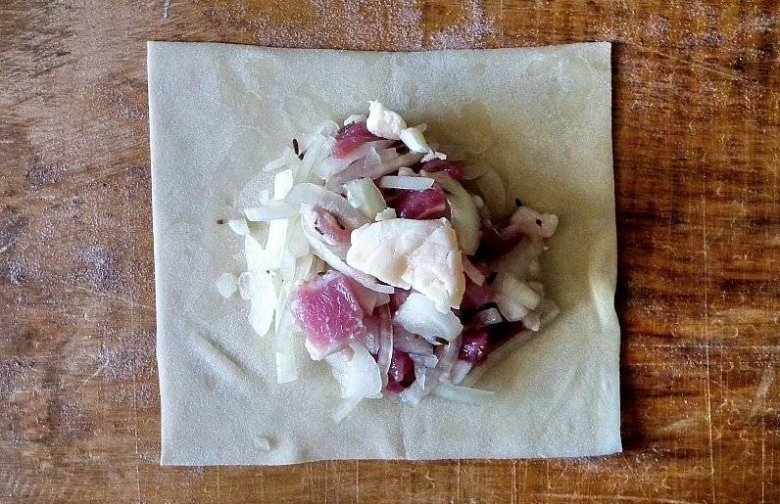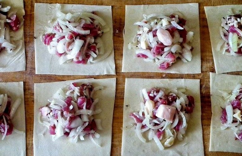 Пока тесто отстаивается, готовим начинку. Для этого берем мякоть баранины или говядины, жирность выбирается по вашему вкусу. Мясо лучше всего не рубить, уж тем более не пропускать через мясорубку, а нарезать мелкими кусочками острым ножом, так получится сочнее и вкуснее.