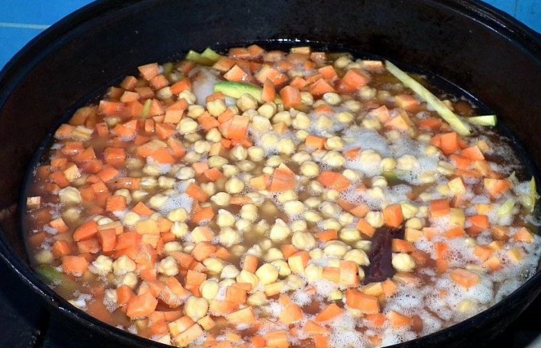 Опустить желтую морковь, положить замоченный горох, слив с него воду.