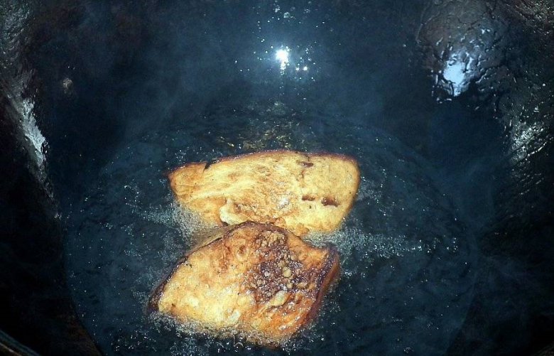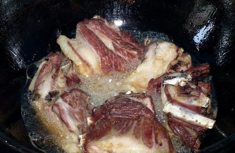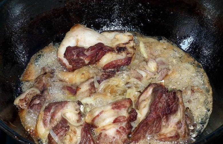 Для ароматизации масла можно обжарить целую луковицу, очищенную от внешней чешуи, до почернения. Удалив луковицу, недолго обжариваем курдюк, порезанный крупными кусками по 100-150 гр. Как только образуется легкая корочка, курдюк вынимаем и откладываем в сторону.