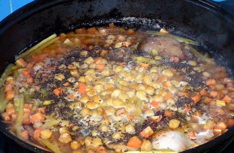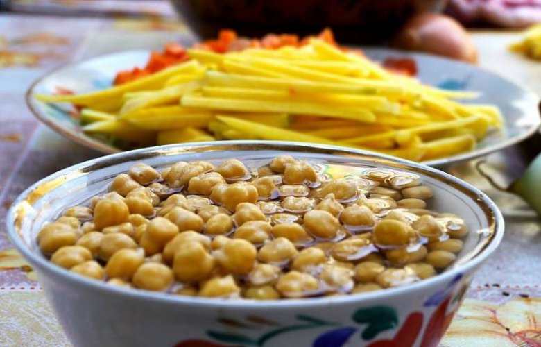 Горох следует замочить в большом количестве прохладной воды накануне.