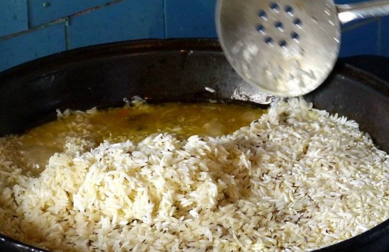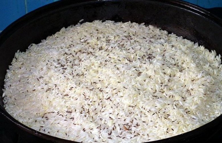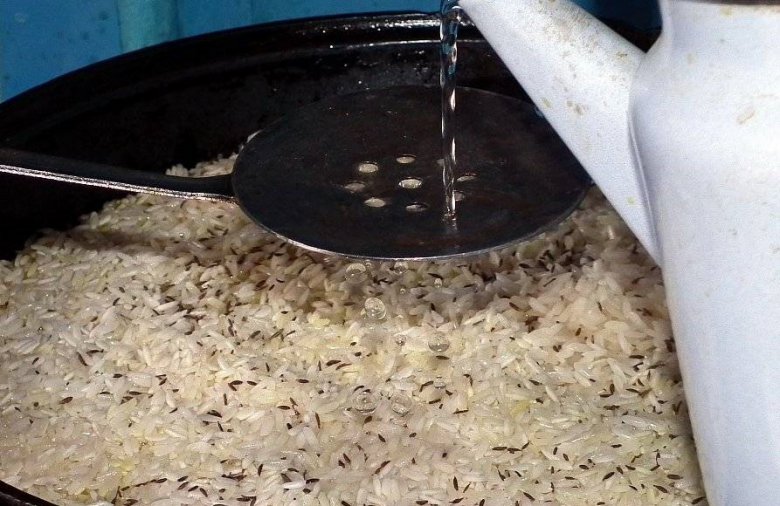 По готовности зирвака, сливаем воду с риса, аккуратно перекладываем его на морковный слой. К этому моменты в чайнике уже должна кипеть вода. После закладки риса огонь под казаном следует поднять на максимум. Кипяток следует наливать при необходимости. Количество жидкости зависит от сорта риса и количества приготовляемого плова.