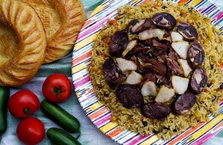 На свадебных и прочих больших мероприятиях плов подается на плоском блюде из расчета на две персоны - накладывается рисово-морковный слой, сверху 2-3 куска мяса, по одному куску казы и курдюка.