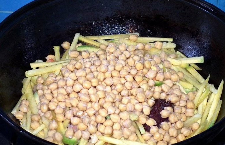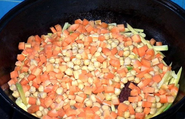 Сверху - красную морковь. Залить холодной водой до уровня содержимого (важно не перелить лишней воды), довести до закипания на среднем огне. Далее продолжать варку при слабом кипении. В домашних условиях можно варить зирвак около 2 часов, не допуская сильного кипения. Не забываем опустить в зирвак извлеченный ранее курдючнрый жир.