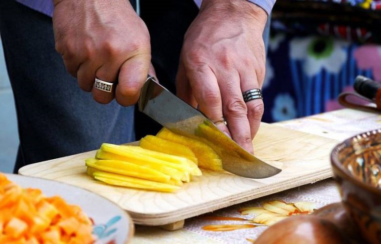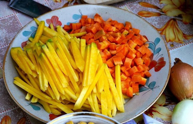 Для разнообразия можно нарезать желтую морковь соломкой, а красную небольшими кубиками. Хорошо, если нарезать морковь за 5-6 часов до приготовления плова и разложить в прохладное место, так будет большая схожесть с настоящим свадебным пловом.