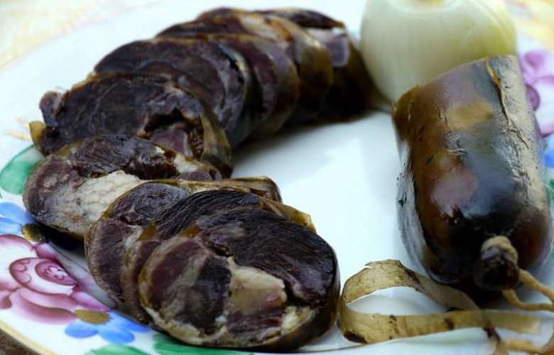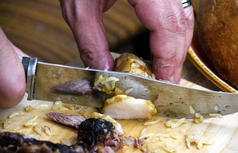 Перемешивая содержимое казана, извлекаем куски мяса и курдюка. Нарезаем их небольшими плоскими кусками.