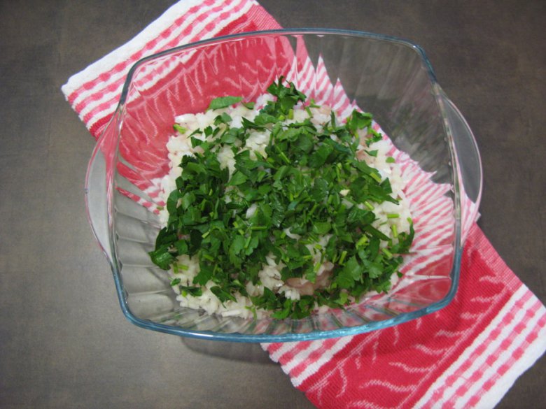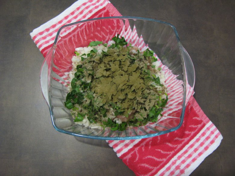 Все ингредиенты смешать в глубокой широкой емкости, добавить хмели-сунели, черный молотый перец, соль и начать вымешивать и отбивать фарш в течение 7 минут, чтобы он стал плотным и однородным.