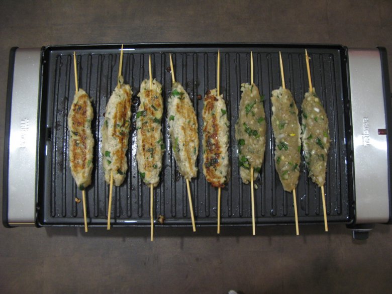 Достать фарш из холодильника, взять небольшую порцию фарша и слегка смоченными в воде руками вокруг деревянной шпажки сформировать длинные колбаски. Кебабы выложить на гриль, смазанный подсолнечным маслом, и обжарить до образования румяной корочки со всех сторон.