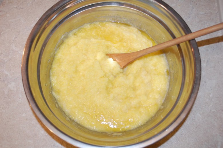 Хорошо перемешать картофельно-луковую массу. Жидкость не сливать.