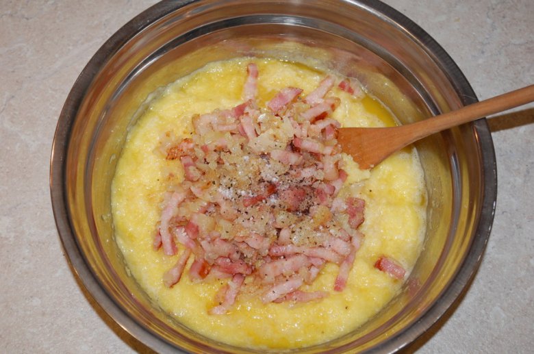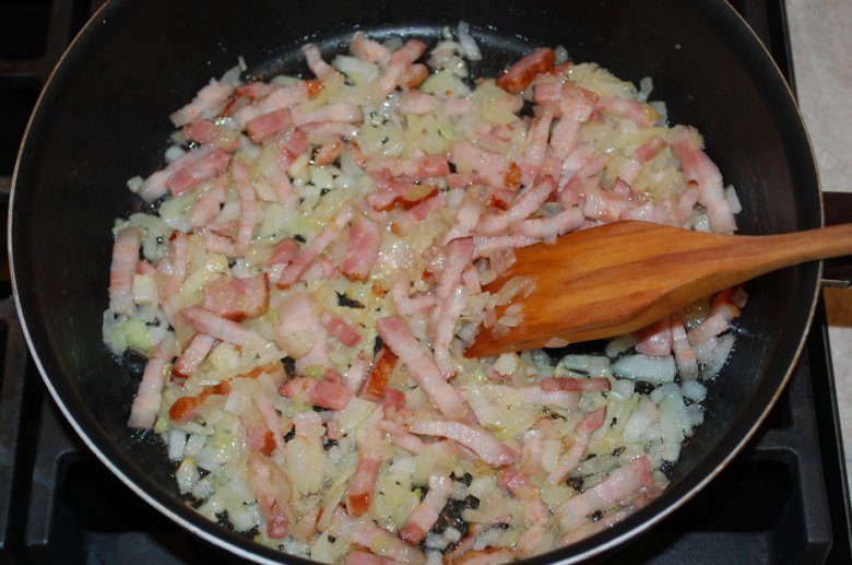 Добавить обжаренную грудинку. Посолить и поперчить. Перемешать.