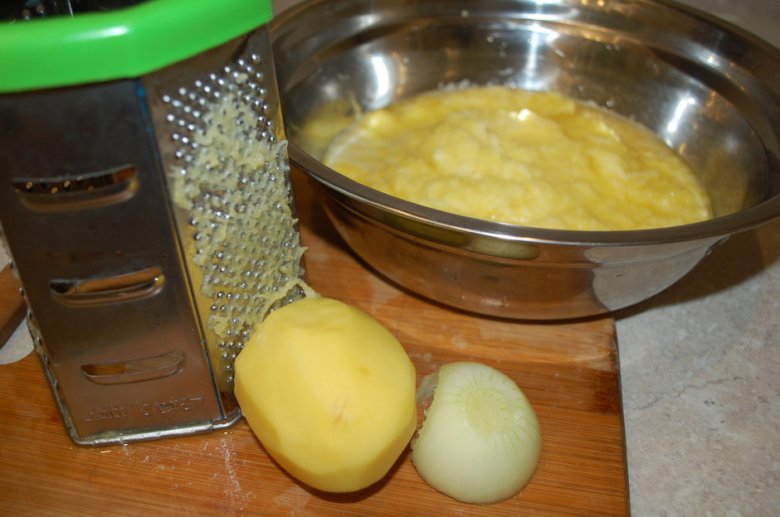 Половину луковицы натереть на мелкой («колючей») терке. Затем на этой же терке натереть картофель, смешивая каждый раз с луковым пюре. Это нужно для того, чтобы картофель не потемнел.