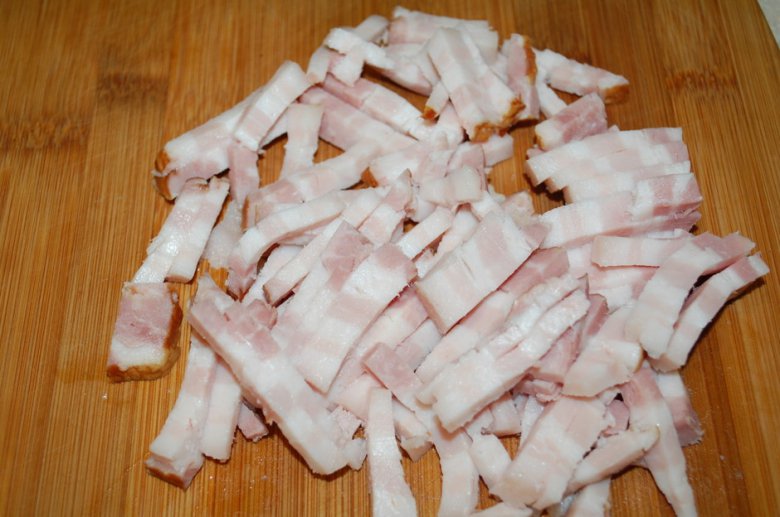 Грудинку нарезать брусочками. Выложить на разогретую сковороду и вытопить из нее жир.