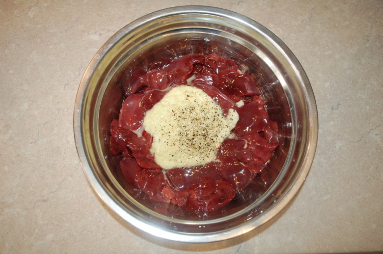 Добавить полученное пюре к печени. Посолить и поперчить.