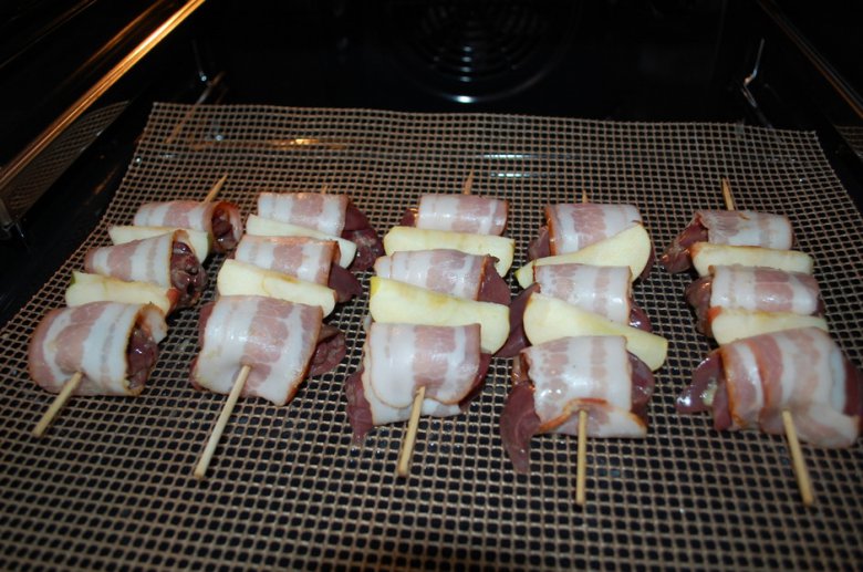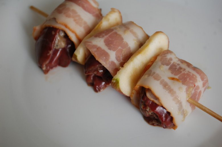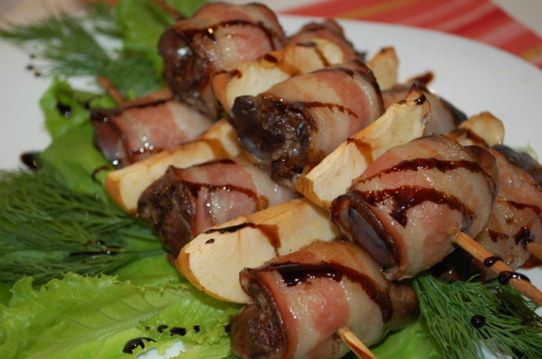 Яблоко нарезать дольками. Каждый кусочек печени обернуть полоской бекона и нанизать на шпажку, чередуя с дольками яблок.
