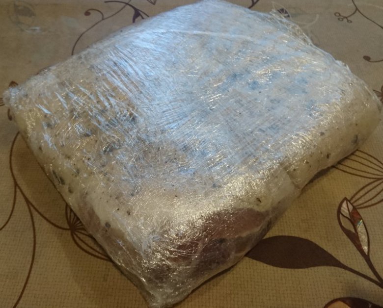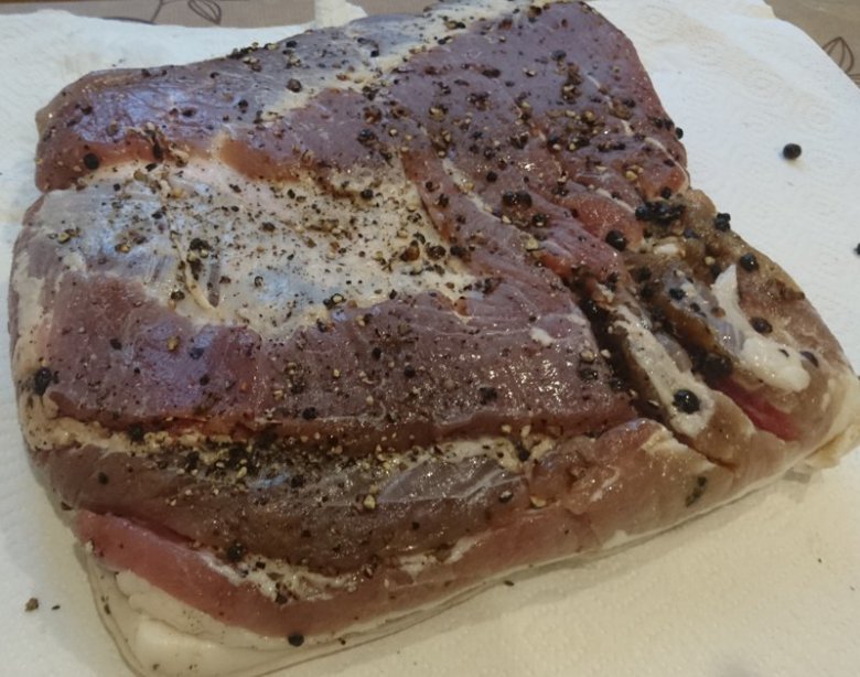 Грудинку обмазал солью и специями, и завернул в пищевую плёнку. Получившуюся мумию убрал в холодильник. У меня она полежала в холодильнике 3 дня, утром и вечером переворачивал её с "ног на голову".