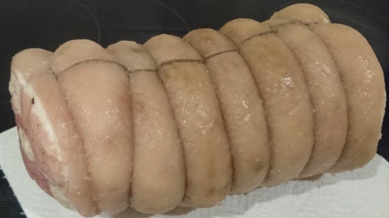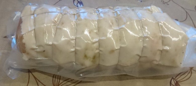 Через 4 часа, как термостат запищал, вытащил грудинку, измерил температуру внутри, была 77 град и отправил её охлаждаться в ванну с холодной водой. Через час. достал вскрыл, очистил от образовавшегося желе.