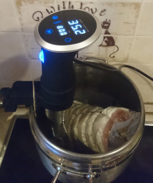 P.S Рецепт, как видите, элементарнейший .... можно повторить и без извращений с термостатом для су-вида, просто в пакете бросив в кастрюлю с водой и контролируя/поддерживая температуру. Главное не перегревать выше 80. И в нитритной соли так же нет особой необходимости,просто без неё не будет розового мяса, чуть меньше будет хранится, и будет чуть другой вкус. Ну и фантазиям с различными специями - нет границ!