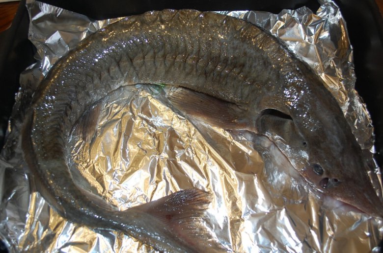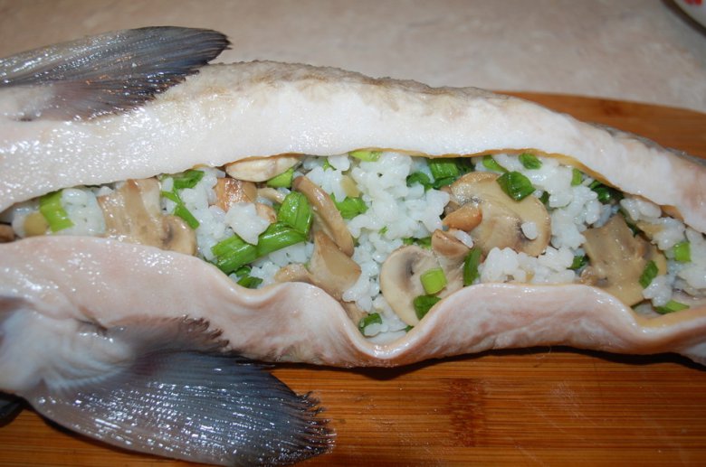 Рыбу вымыть, выпотрошить, удалить жабры. Снова промыть под струей проточной воды. С внутренней стороны (возле головы) надрезать позвоночник, но не до конца. Сделать это лучше с помощью ножниц. Такой же надрез сделать возле хвоста. Теперь нужно удалить (вытянуть) визигу. Это делается для того, чтобы при запекании у рыбы не разорвало кожу и внешний вид остался красивым. Посолить и поперчить рыбу со всех сторон.