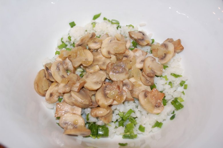 Соединить готовый рис с грибами и зеленым луком.