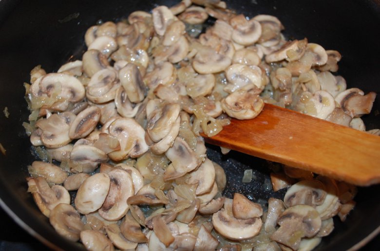 Шампиньоны порезать пластинками и поджарить вместе с луком. Рис отварить.